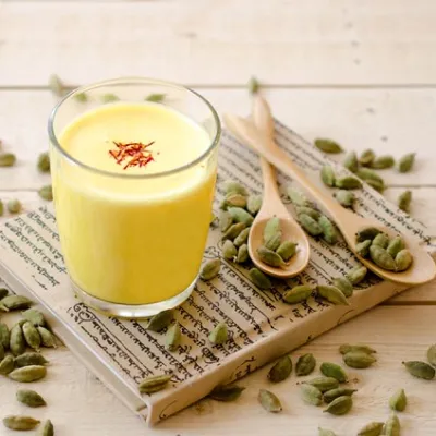 "Kesar milk: a luxurious beverage infused with strands of saffron, blended with warm milk, and delicately sweetened, offering a rich and aromatic experience cherished for its indulgent flavor and vibrant color."